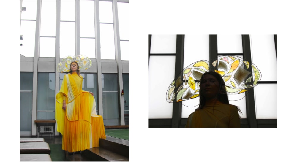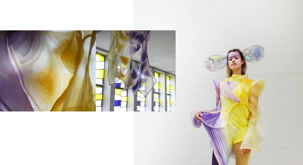 Now in isolation and with limited access to the exterior world, while others belonging to the College’s graduating cohort have focused on rendering their designs digitally, Warnke continues to work with the importance of physicality. This has only been further encouraged by his return to his hometown of Würzburg, a sleepy region in South Germany. It was in Germany’s modernist churches, transfixed by the contrast between cool concrete and soft coloured light from stained glass windows, that Warnke found inspiration for his final collection at Central Saint Martins. This light is refracted across his collection, each garment gently fading from one hue to another. His gowns erupt at the hip, forming cubist curves. Silk jersey is draped from their frames, hand-dyed in lemon and lilac; the arrangement of silken swathes over steel alluding to the idea of the window. Organza is laser cut and layered, diffusing from a concentrated centre towards transparency.