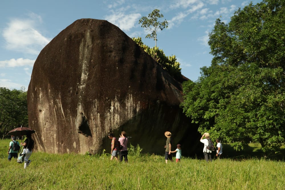 [Catalina:] I will speak here from an architectural perspective. We – and here I mean all the authorial team - went through important realisations throughout the process. All formed as architects, and hoping to inform the design of the constructions that will host the Inga University, started with an idea of mapping as a search for Inga architectures in their physical and material manifestation. The journeys across territories asked us to rethink, broaden, and amplify this query. Architecture in its porous nature manifested itself as a question of what dwelling means and symbolises for the Inga peoples of Colombia in their ancestral lands. This implied observing and embracing different forms of life – as is the ritual of lighting the tulpa (the heart and place of fire) and share while sitting around it. To enter a symbolic space respectfully if it is the place where ancestral medicine is taken and to the chagra of a mamita. Or re-learning that sacred plants should be used when asking permission from the spiritual beings who guard the territory and to harmonise it before it can be inhabited and constructed upon.