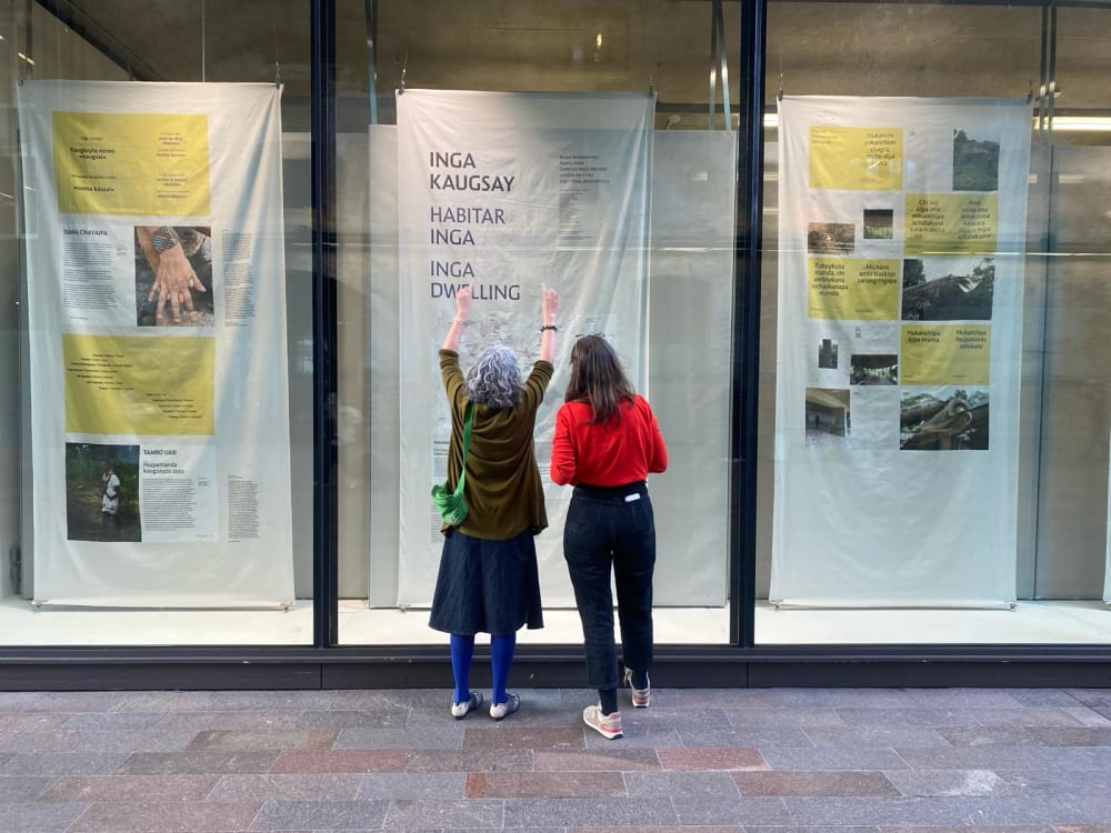 At CSM, we celebrated the process this ongoing project has entailed with the exhibition Inga Kaugsay,13 March to 10 May 2024 in CSM’s Window Galleries. The exhibition was co-designed and co-curated by Graphic Communication Design Senior Lecturer and publication designer Abbie Vickress and Spatial Practices Senior Lecturer in Climate Studies and publication co-author Catalina Mejía Moreno.