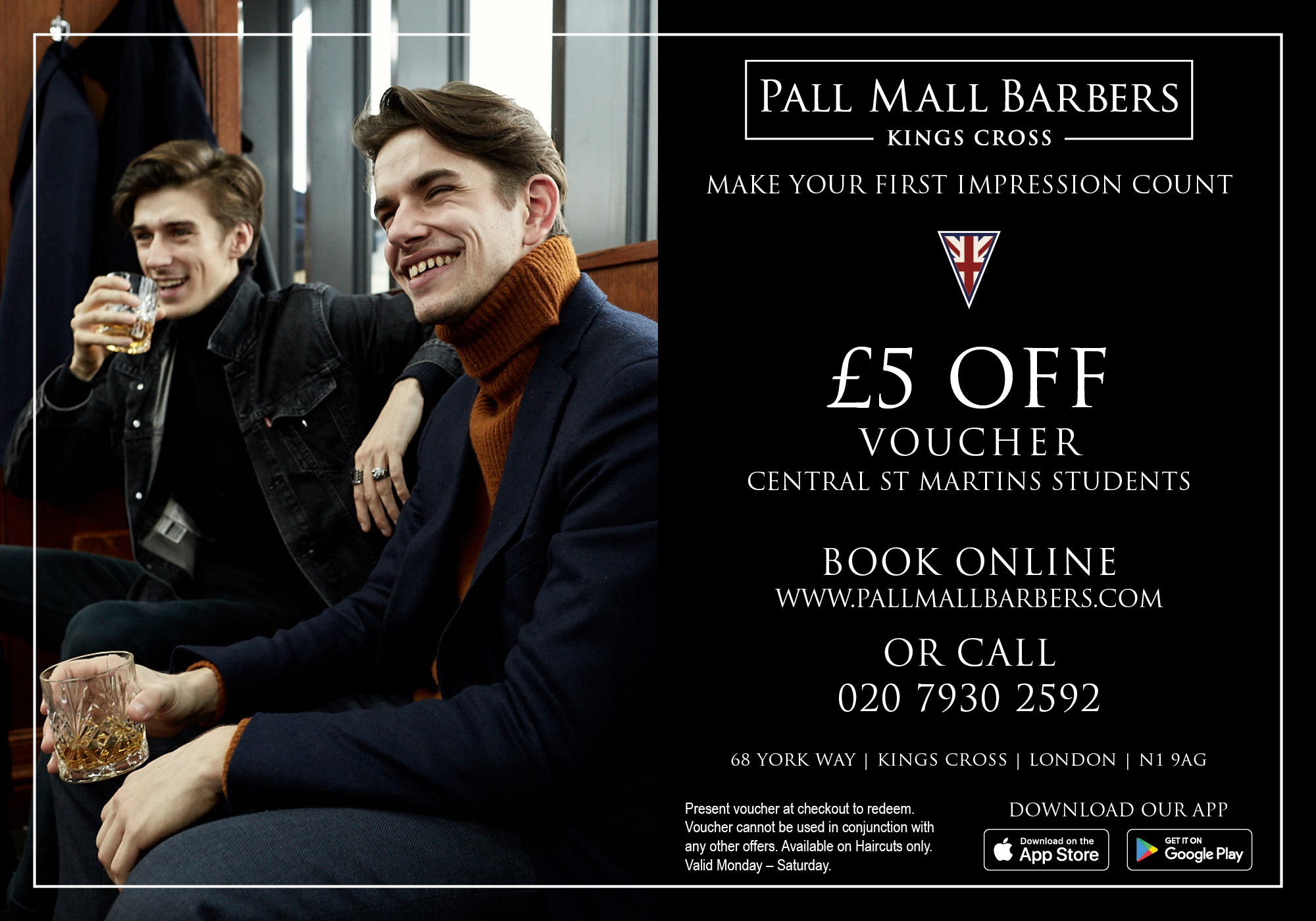 Pall Mall Barbers offer CSM students £5 off haircuts Monday-Saturday. Simply bring your CSM ID card and the voucher found via the link above with you to your appointment. Please call +44 207 930 2592 to book. -