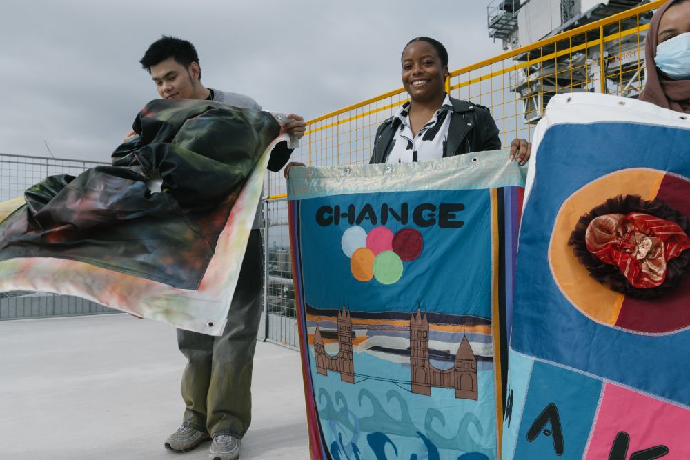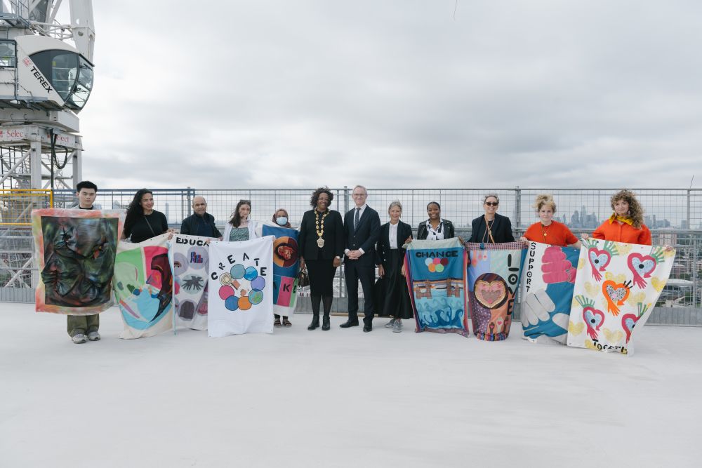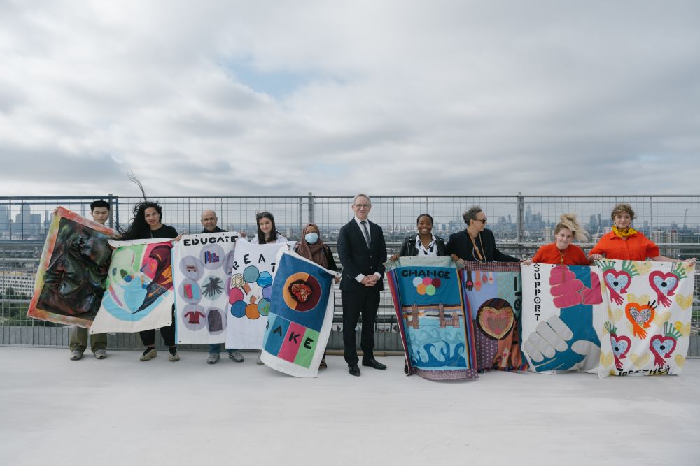 To mark the occasion, a selection of beautifully stitched banners were unfurled by the participants of LCF's Making for Change after a short speech by President and Vice-Chancellor of UAL, James Purnell. The banners have been designed and made by women from the local Tower Hamlets and wider communities, current LCF students and emerging designers from East London. The banners represent values of inclusivity, collaboration and authenticity alongside the themes of sustainability, community, and accessible education for all. They encapsulate the heart of LCF’s community and represent LCF's ethos of shaping lives through fashion.