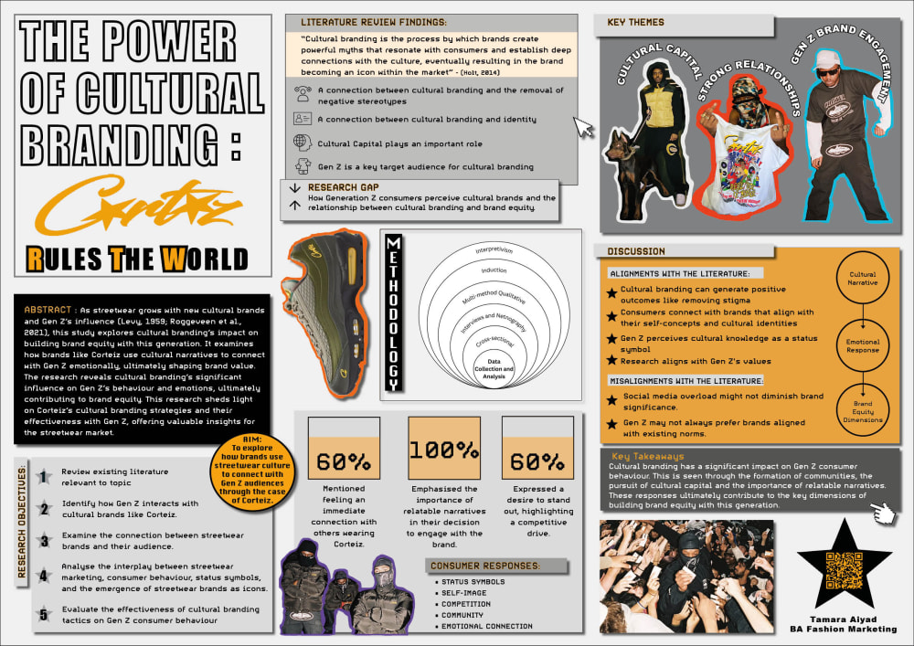 The focus was cultural branding, where brands create myths, or cultural narratives, that connect with their audience and connect them with a culture. Corteiz was my case study for investigating how cultural branding created deep connections with Gen Z specifically. There's no concrete research on why Gen Z is going crazy for Corteiz, which intrigued me.