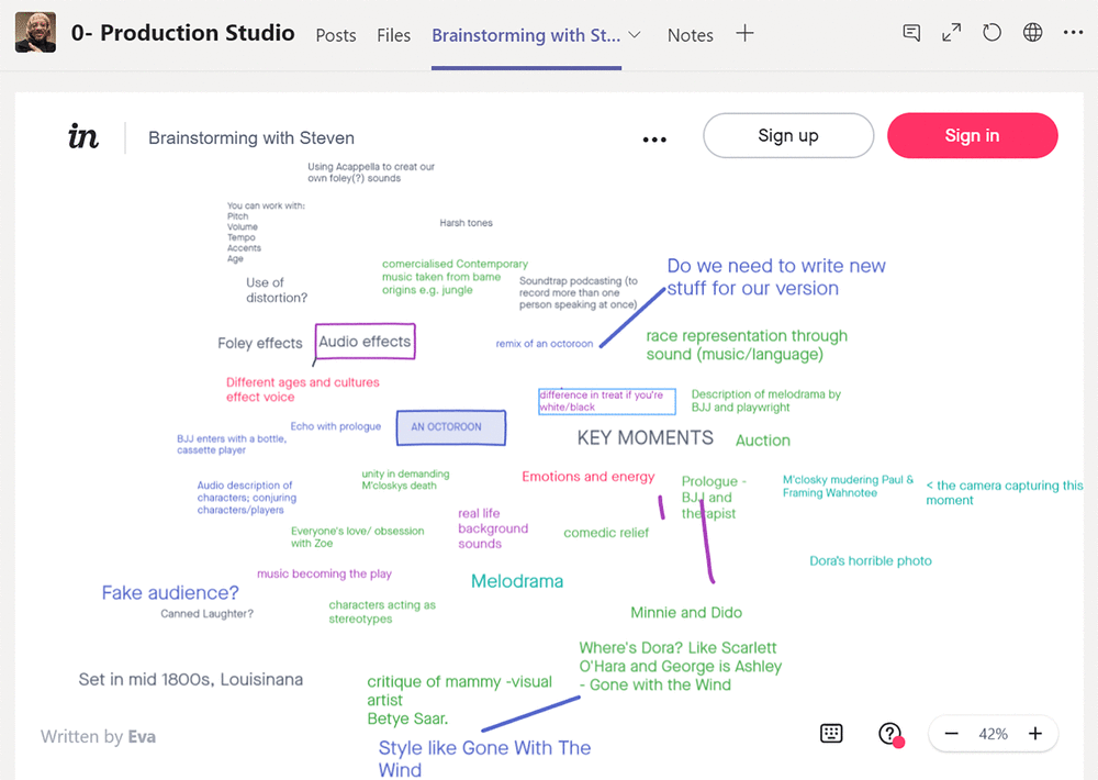Once we got closer to the production weeks I held weekly cross project Company Production Meetings for the An Octoroon and Suddenly Last Summer teams. This helped to anchor the lighting and technical activities into a production-like approach and guided students through the planning of their final recordings, editing and presentation of their work.