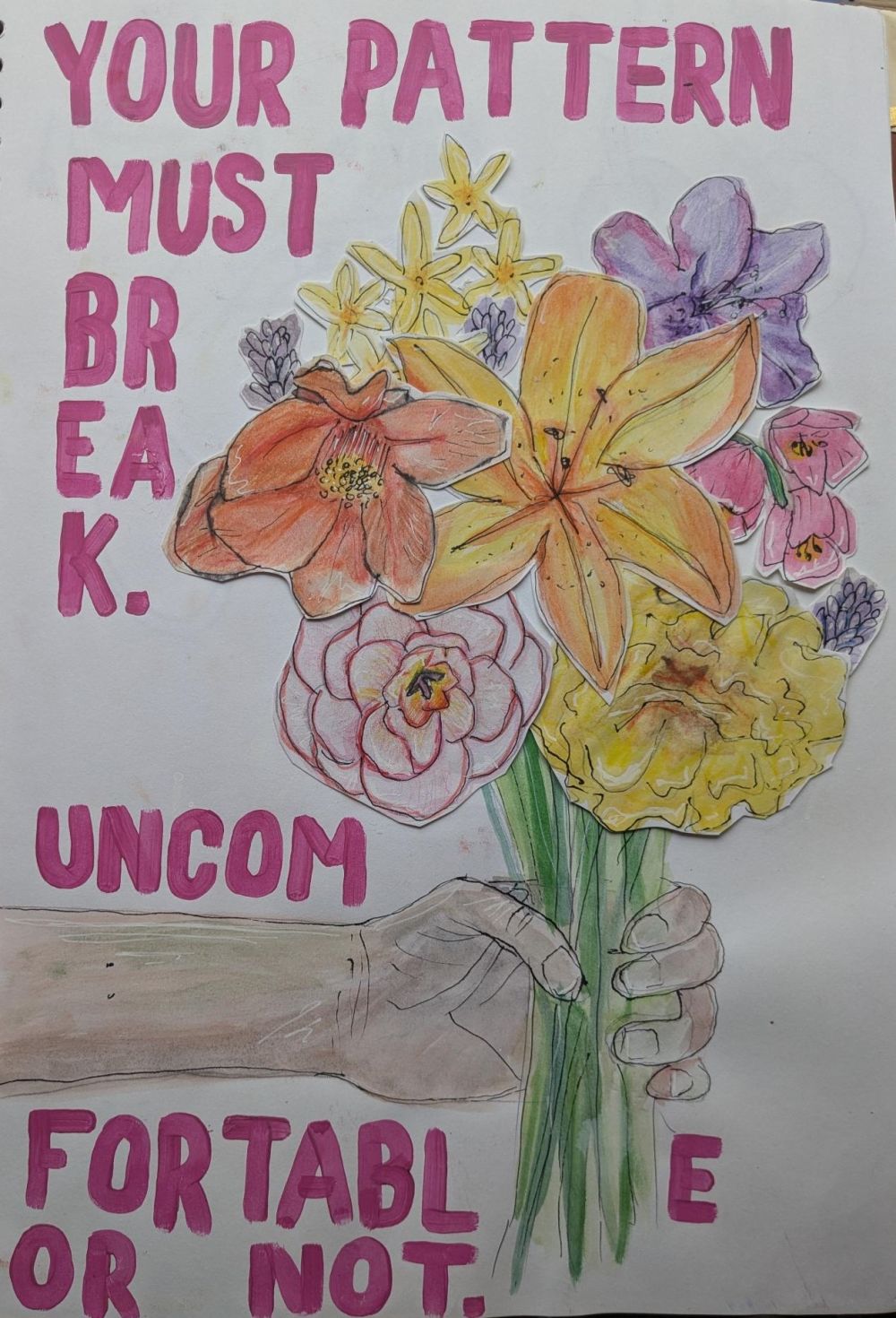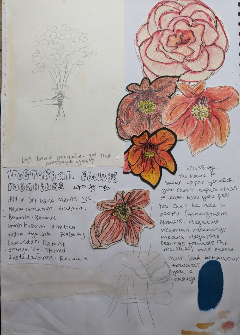 At first glance, a pretty bunch of flowers is a clear and positive gesture. However, I couldn't help but hide a concept there. Different flowers had different meanings during the Victorian times. I made a bouquet with flowers that all have negative meanings. The giver would hope to be sending a negative message, whilst the receiver would be thankful for some beautiful flowers - something that needs to be explained for the piece as it would in actuality. The overall message of the piece highlights how important clear communication is, and that you can't expect people to know how you feel."