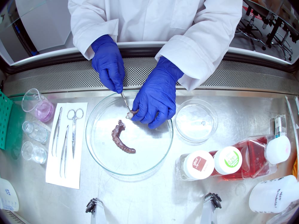 A. My final project is called Octopussy, which explores the manifestation of meat in relation to culture. In essence, I explored three different means of producing meat: fishing, aquaculture, and cellular culture (aka lab grown meat) in order to reflect upon the consumer cultures that drive their realisation. I did this through the lens of the octopus, an almost alien-like creature that has inspired strange, fetishised social cultures, of which I intentionally investigate in order to play upon the strange, fetishisation of meat cultures, predominantly cell cultured meat. I approached the new, interdisciplinary world of Biodesign via ‘Critical Design’, so my physical outcome manifests as an edible “cellular lingerie line” — lingerie made from cell cultured meat that I grew in the lab — that is not a product for mass consumption, but rather a prop for igniting curiosity and conversation around society’s fetishisation of technological solutions to innumerable ecological crises. Our desire to do this is explored in my short documentary with interviews from key figures of the cultured meat debate which can be found on my graduate showcase page.