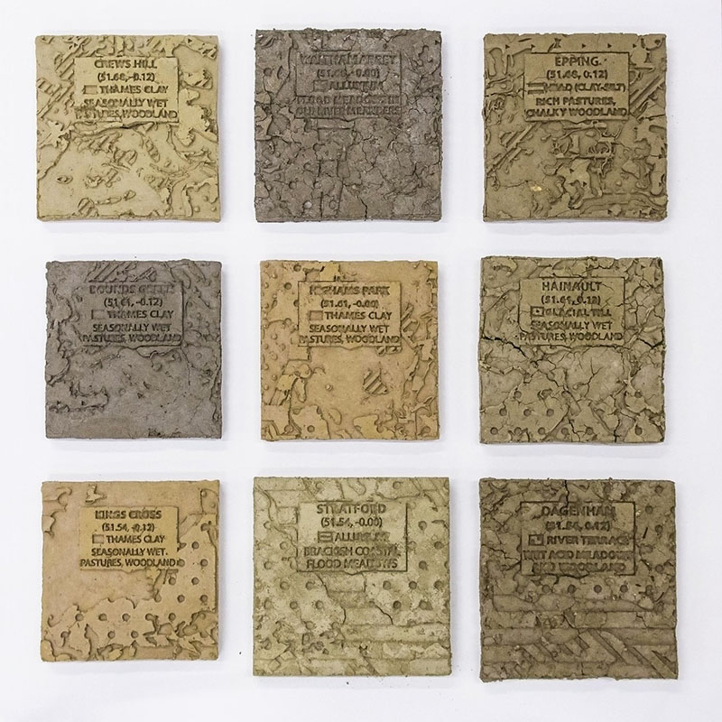 There’s a direct link from my practice in Joya, although my ambition here has been to access an audience beyond the limited confines of the art institution. I’ve made the work as sustainable as possible. The work shown inside the art gallery comprises dug-up earth samples from each of the nine points, collected via public transport and processed using recycling materials and tools (the ceramic works reduce the sustainability quotient). I’ve attempted to create a visceral and emotional experience, using earth which is drying, cracking and degrading over time.
