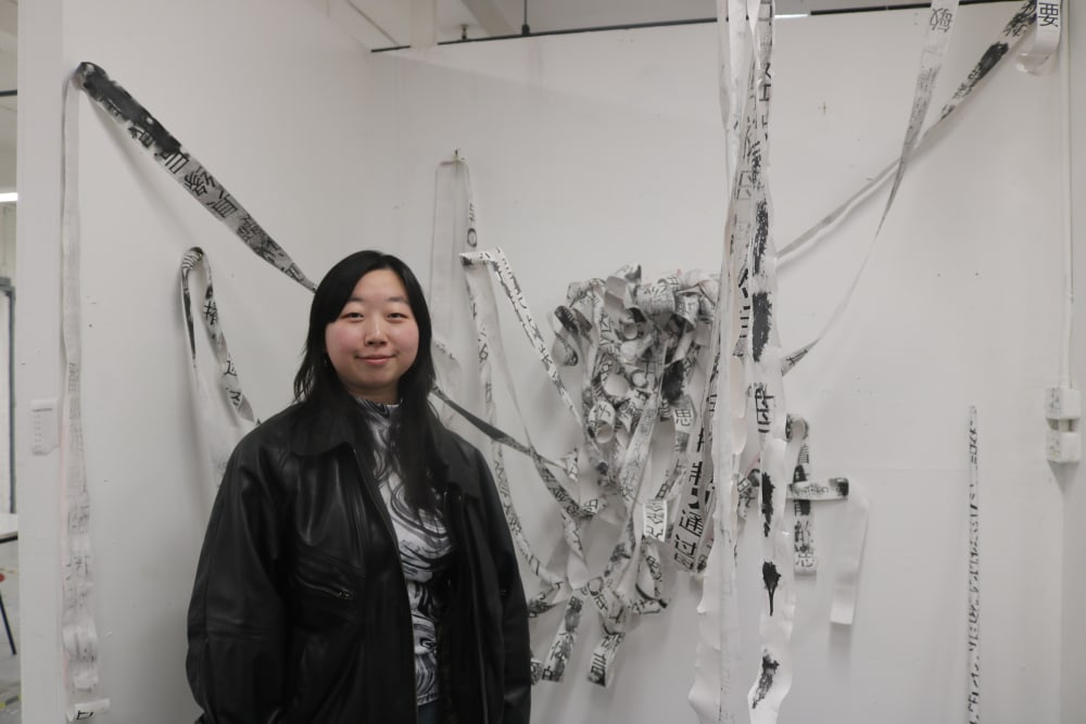 Opposite Emily's studio space, you'll find the works of Yunyi Ye, where the Chinese artist explores different forms of speech. For Momentum, she performed in her studio space and presented works on paper, as well as pieces involving steel, wood, and rust.