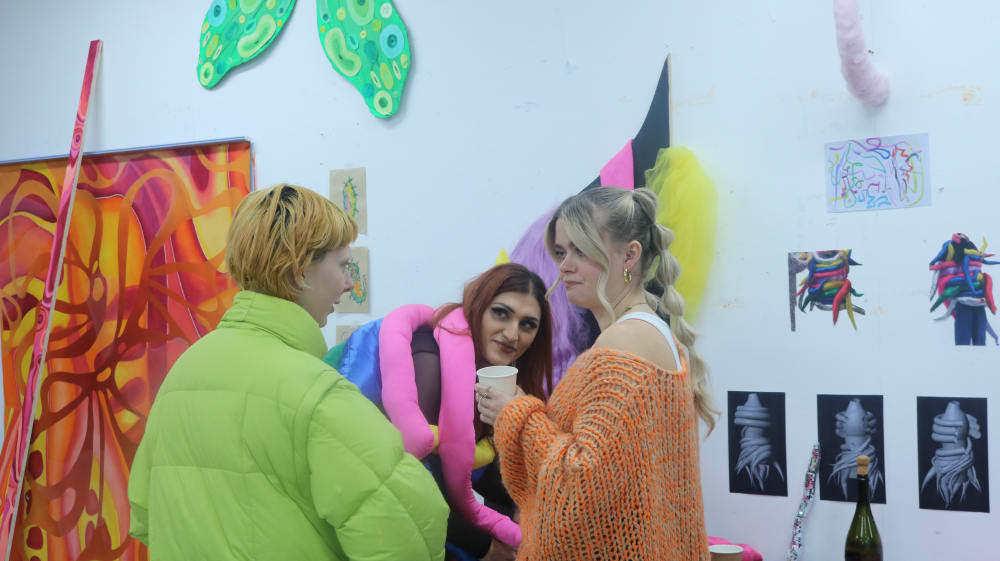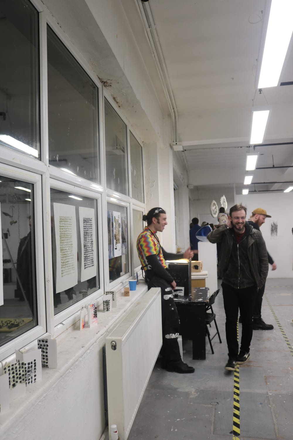 It was an exceptionally cold evening for London. Therefore, queuing visitors like me were warmly asked to squeeze together in the entrance space so that no one would get cold. We all received a quick introduction about where to find each studio within the building on Elthorne Road. I found it quite amusing that the nibbles on the second floor were pointed out in such a succinct way. Who would really care about nibbles when presented with such an inspirational display of artwork and studio spaces? Perhaps I should have tried the nibbles, but as a visitor, I couldn't have cared less. Exploring these studios felt like being drawn into a big warm cloud of creativity that only releases you when you manage to detach yourself from the addictive energy these rooms and artists radiate. The sounds, colors, and atmosphere offer a beautiful ride, which guides you through the narrow passages where one artwork follows the next.