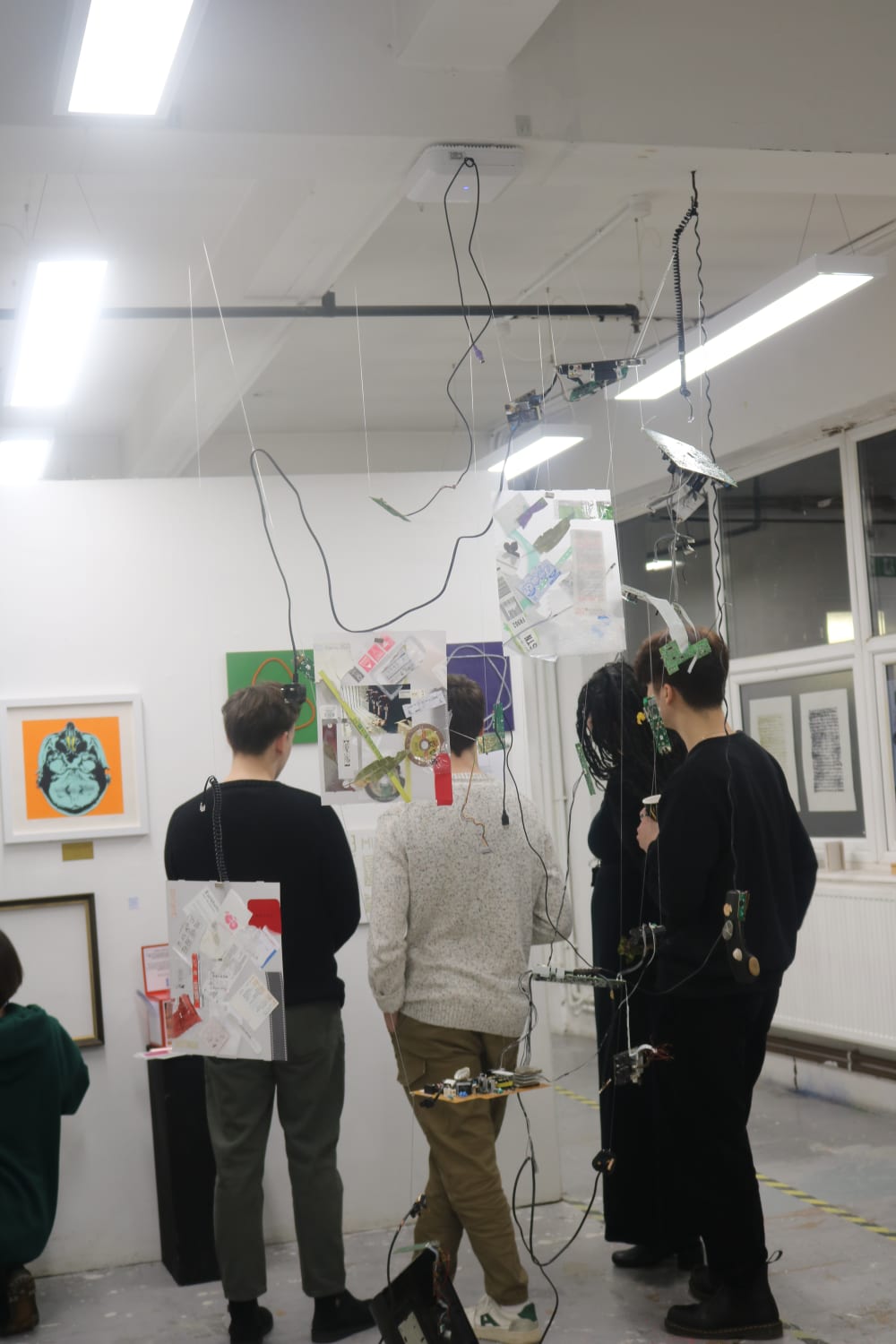 Entering the space on the ground floor, dedicated to the second-year Fine Art students, felt like being immersed in a vast and untamed cloud of art. Angular tones of a violin, paired with red and dark lights, emanated from a smaller room, separated only by a white curtain that occasionally offered a glimpse into one of the intense performances. At different times in the evening performances were given by various artists on all levels of the building.