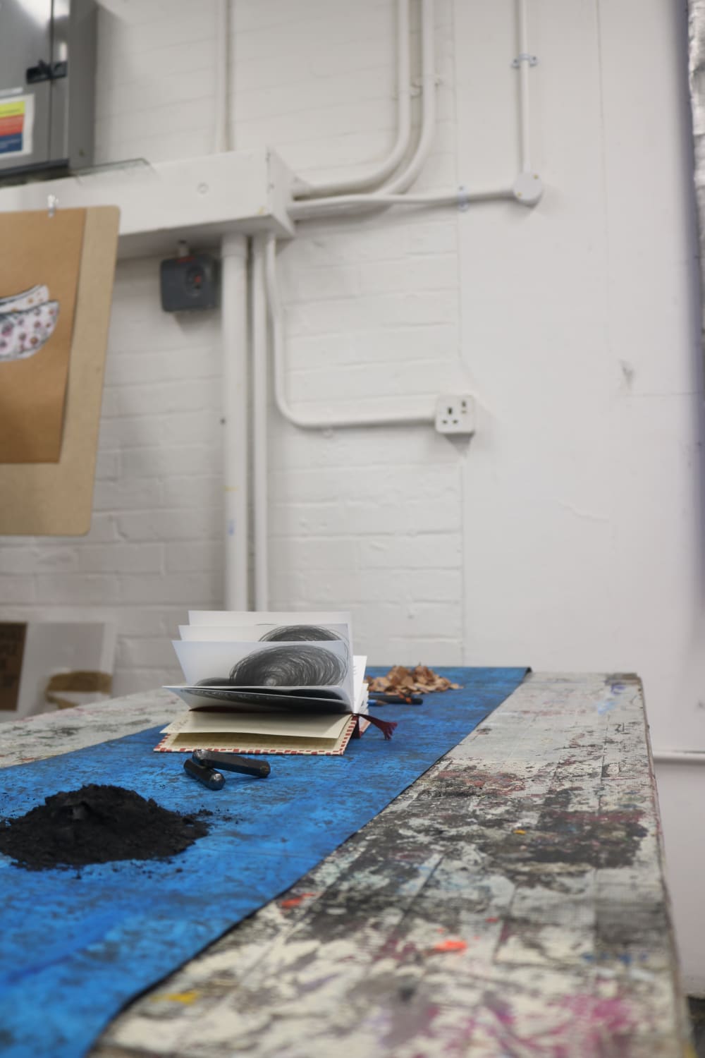 The idea of the Open Studios, which take place once per term, is not only to open their doors to the public but also to promote community among different courses and cohorts. After making my way through the crowded elevator, I found myself on the first floor, the domain of the first-year students of Fine Art, where thankfully I met Emily Bottomer. The young artist began her studies at CSM last September and guided me through the studio spaces of her class.