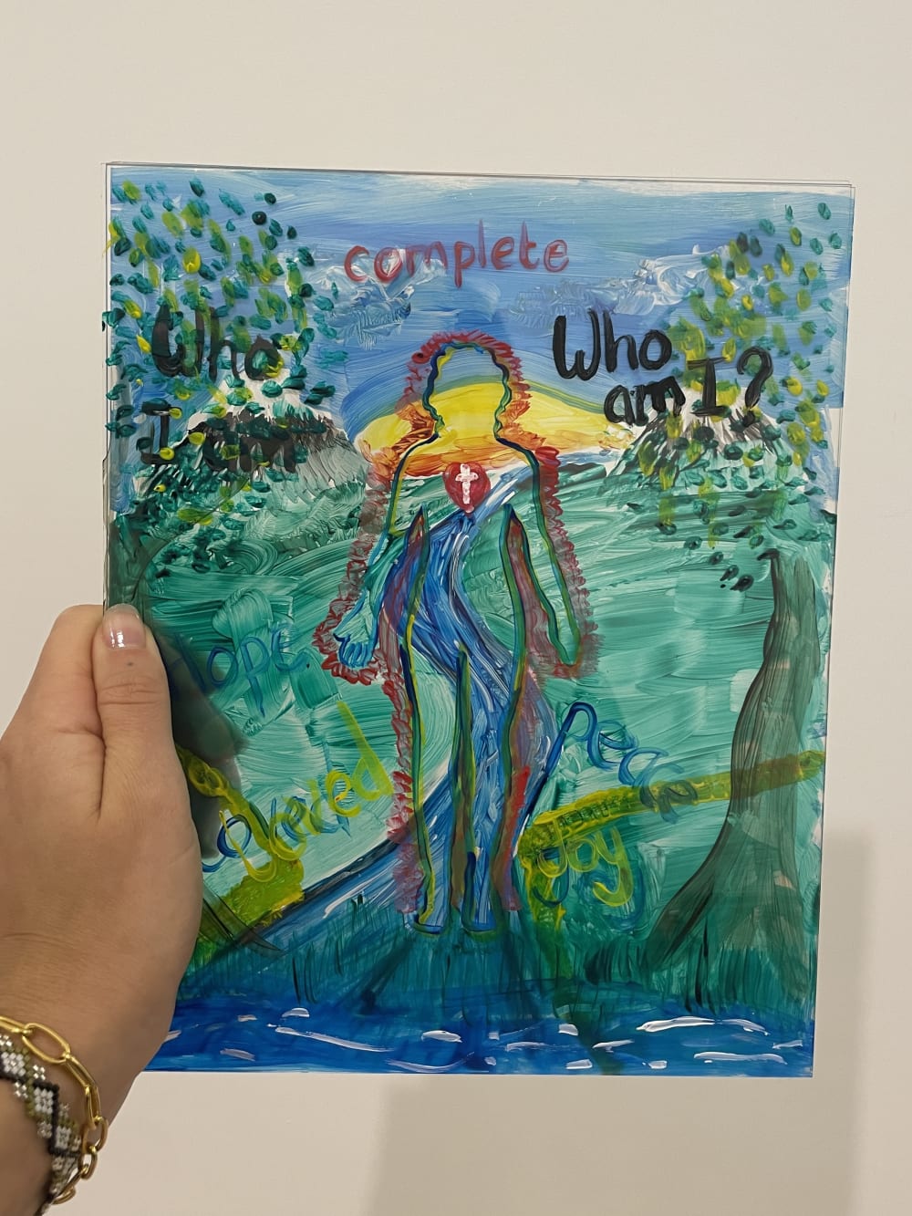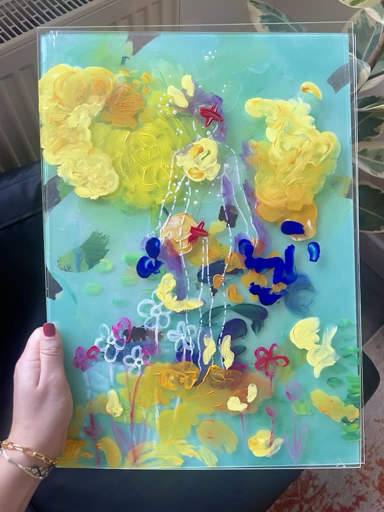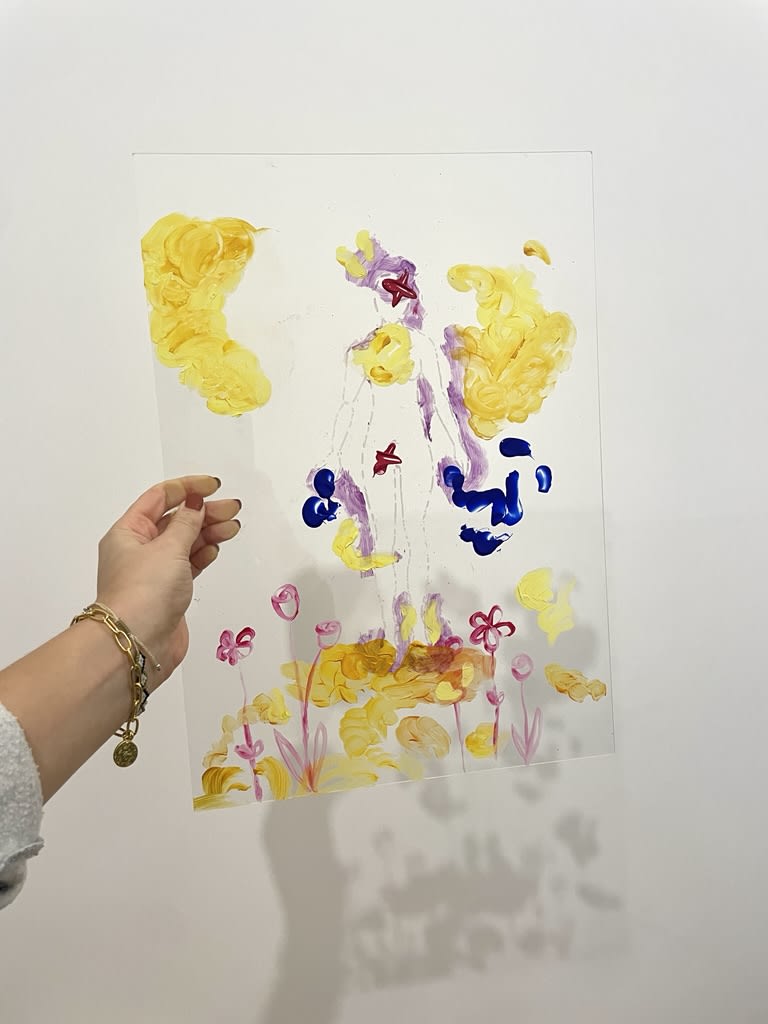 Conversation was paired with art-making, each participant was mailed the necessary materials and a worksheet that outlined some art therapy inspired exercises. The exercises focused on expressing sensations of physical or emotional pain in the mind and body, taking the pain outside the body on a separate artwork, and then healing those emotions and sensations with new artistic expressions. Each step was made on a separate transparent acrylic sheet in order to then be able to layer each piece over each other and create a layered painting of experiences with prosthetics.