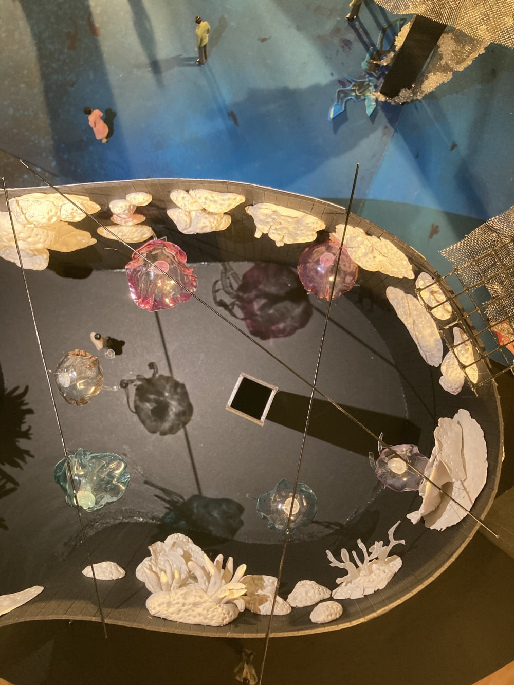Lu Wang’s final work follows a different approach. In her site-specific installation for the Tate Modern, the audience is invited to immerse themselves in an exhibit shaped like a vortex of water, with pink and blue-designed jellyfish hanging from the ceiling, while large white fragments of dead corals are mounted on the walls – a compelling invitation for viewers to dive into Lu’s playful design representing the ocean.