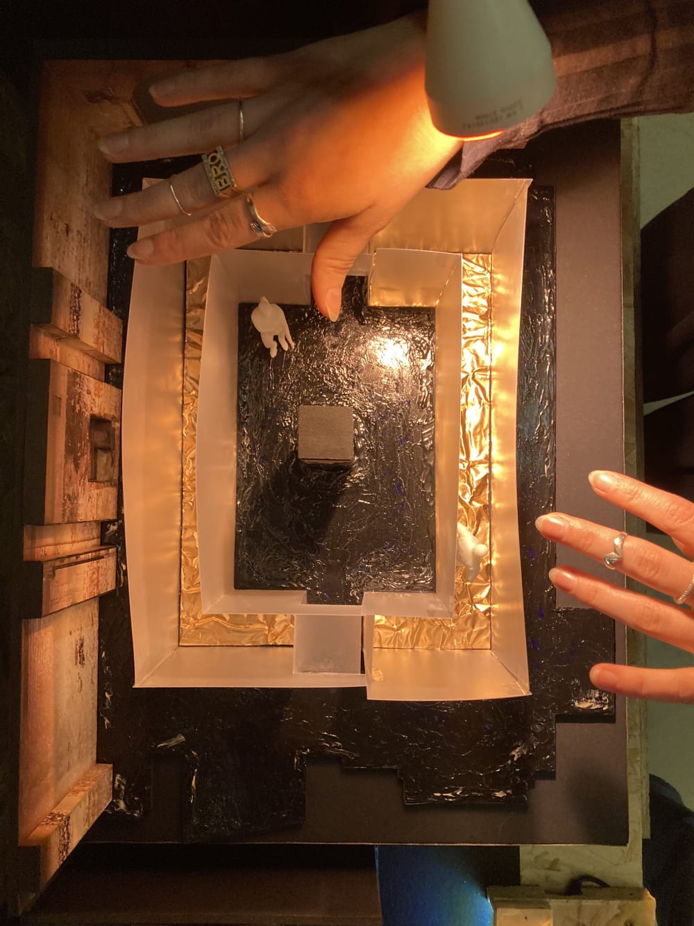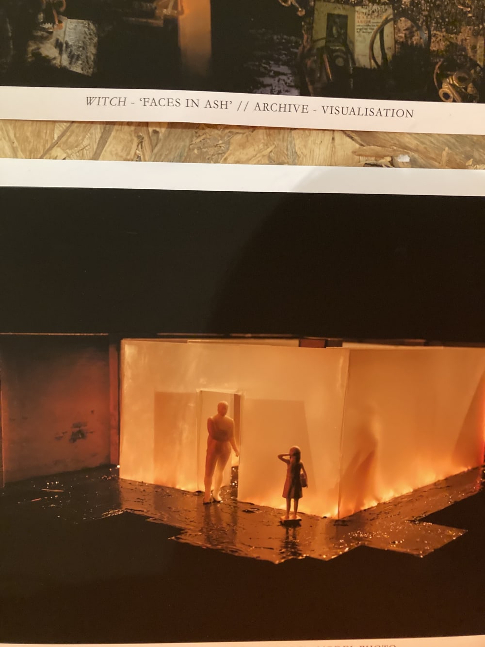 In the middle of this promenade theatre set, Lucie places a wooden pillar half-covered in black oil to touch on the witch hunts and burning, that Federici sees as a restructuring of women’s roles within society and family during the rise of capitalism. Between the inner part of the rectangular set and its outskirts, the designer has planned to have a space that is only accessible to the performers. The contrasting golden floor of this area allows the two Narrator Witches to be illuminated by a golden glow. Within this set design, Lucie has created a dynamic space in which both the audience and performers can interact with what is seen, unseen, or brilliantly accentuated.