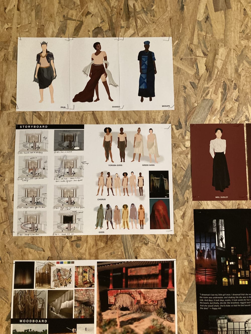 The postgraduate students in this course are also tasked with developing costumes for their respective designs. For Inua Ellams' piece, Ankita created costumes that reflect the protagonist’s dual identity as a half-Nigerian mortal and half-Greek God. Her design primarily features flesh-colored body suits, and to differentiate the Gods from the chorus, the young designer proposes dressing the cast in transparent cloth.