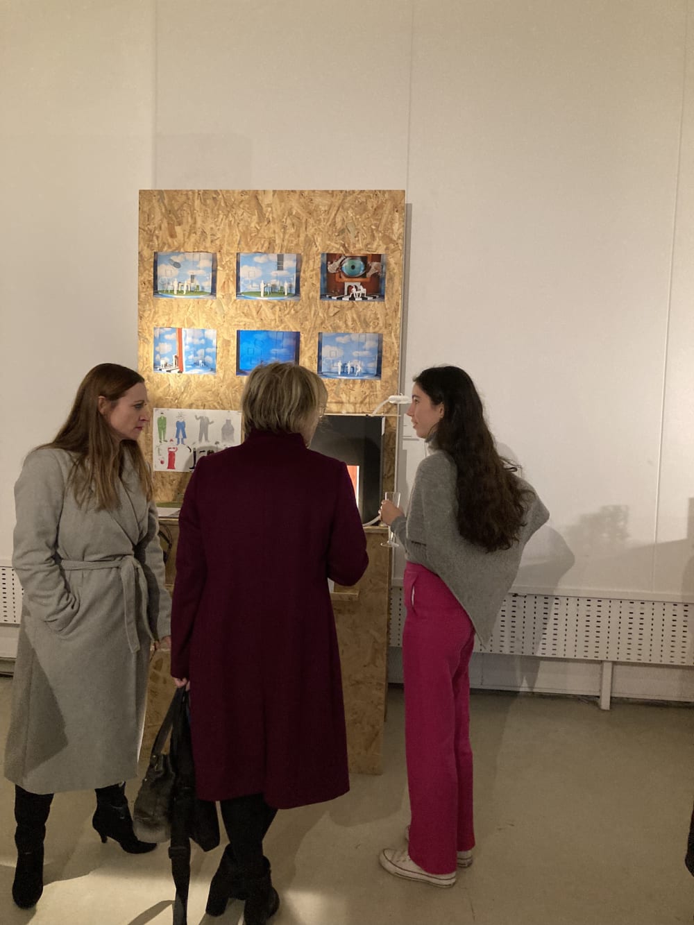 Lu has a background in costume design for theatre and screen and is a passionate diver. These experiences inspired her installation. Her love for the sea world and her research on the drastic consequences of sea pollution resulting in coral bleaching motivated her to create this design. The concept behind her work is to immerse the viewer in a sea world by walking through corridors shaped like waves. At the beginning of the installation, the corridors are narrow but gradually widen, culminating in the spectator emerging from the undulating passage into a wide and open space dominated by a dark wall painting and massive industrial pillars wrapped with flourishing corals, showcasing nature’s colorful beauty. Lu discovered during her research process that unused pillars of old oil platforms provide a great habitat for a new form of coral.