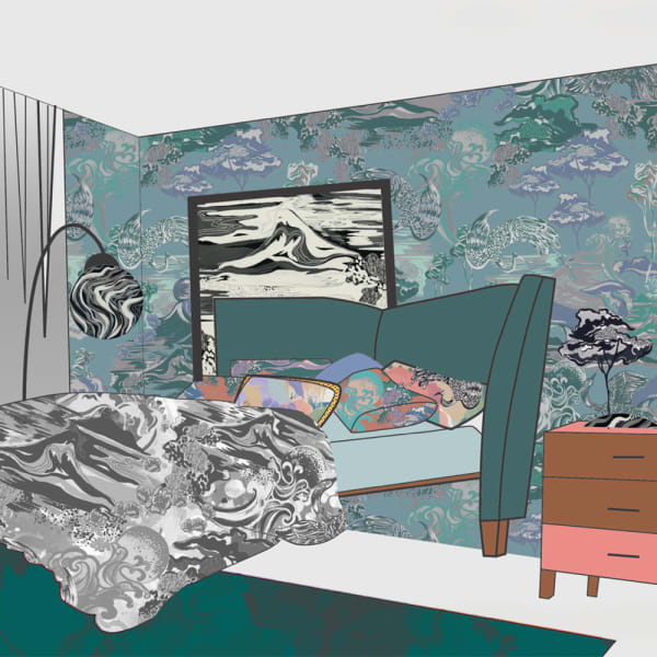 Inspired by natural environments, René finds that natural images often appear in her work, “I love drawing inspiration from nature,” she says, “I enjoy wild swimming and hiking, so the river and the ocean are a huge inspiration for me.” She also has an interest in architecture, fashion, and textiles, which each inform her work in some way.