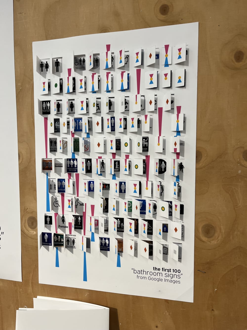 Yes! My last project of the term was an Information Design work that consisted of a semiotic research about bathroom signs, focusing on how they are used to represent gender. My input was the first 100 ‘bathroom signs’ from Google Images, that I studied to create parameters to analyse the symbols, which were, firstly, the type of bathroom (men’s, women’s, all or not specified), then whether it presented a binary idea of gender and finally how stereotypical the sign was, indicated by a scale. The first layer of the outcome was a diagram presenting the visual parameters of each symbol, and the layer underneath showed the actual pictures, that you could access by opening door-like folds. And as this is a subjective theme, I was very interested on other people’s thoughts about it, so I included a miniature bathroom door and markers at the Open Studios for people to interact with it.